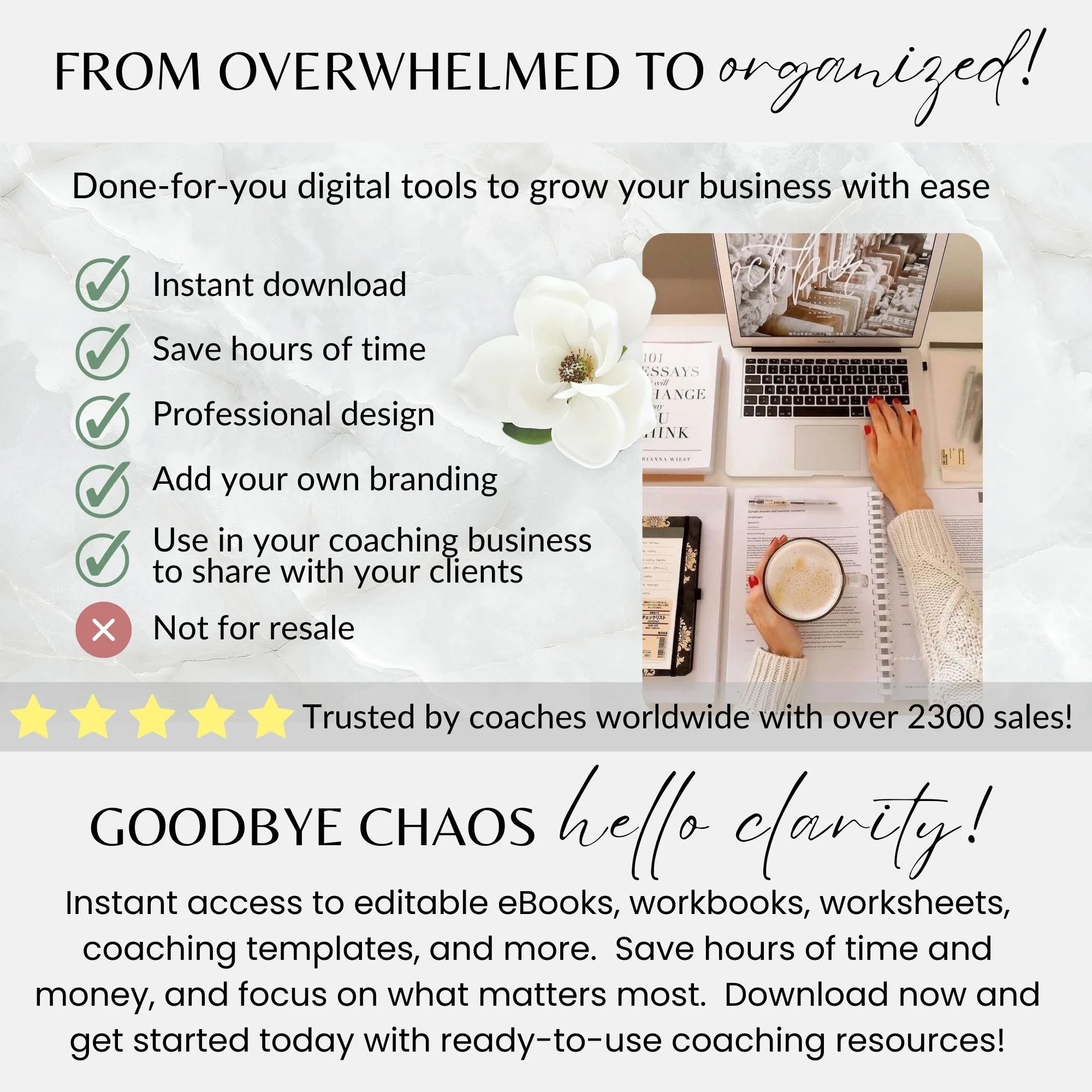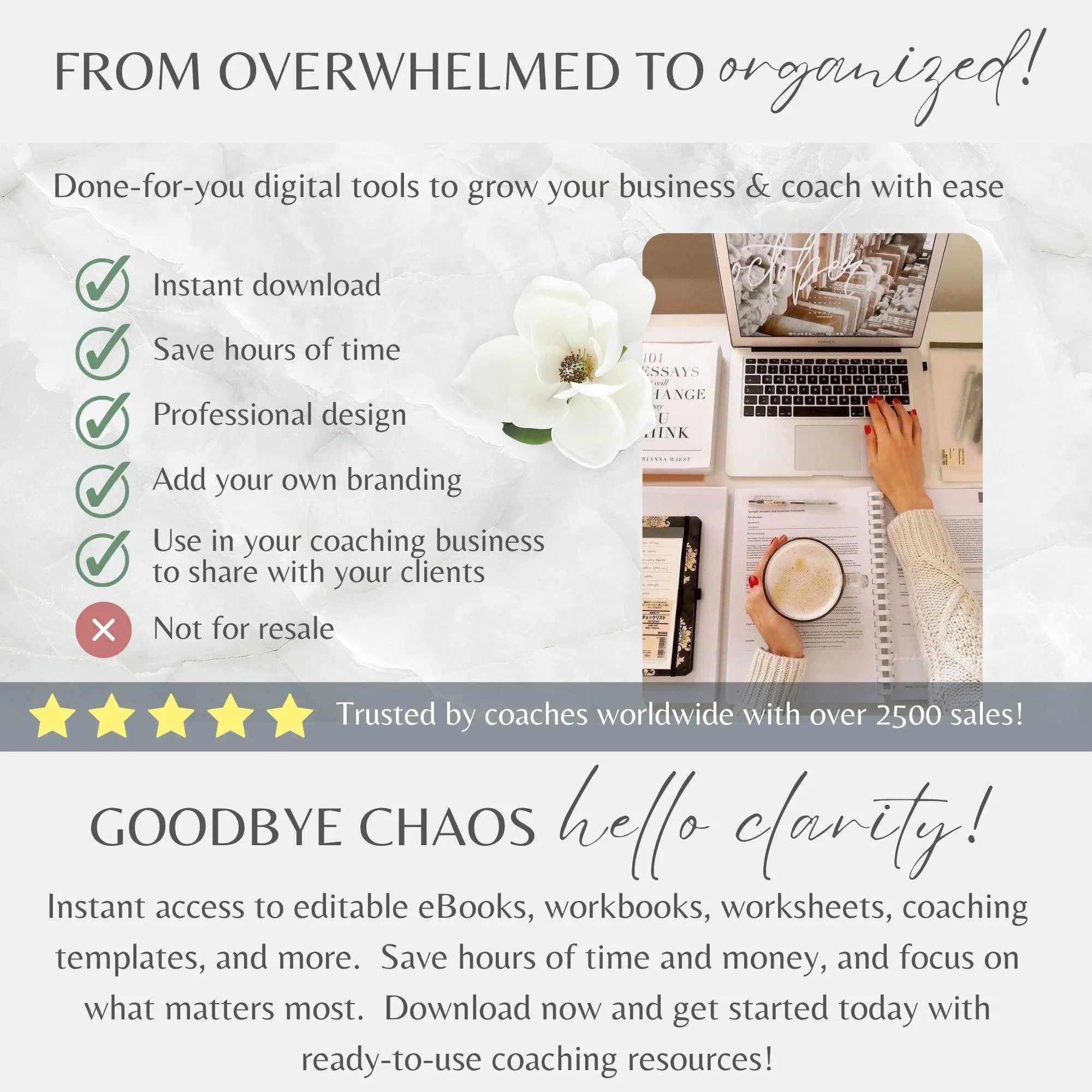 Please note this item does not include resell rights. You can use in your coaching business or for personal use, but it is strictly not for resale. It may not be reproduced, replicated, or resold in any way.