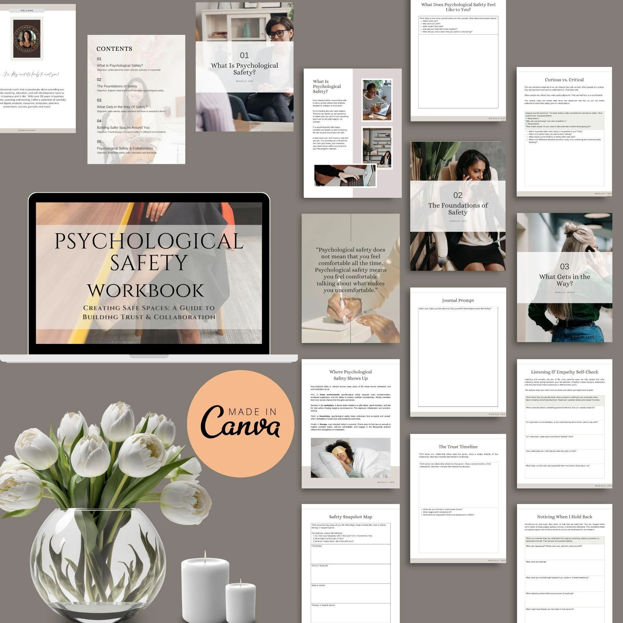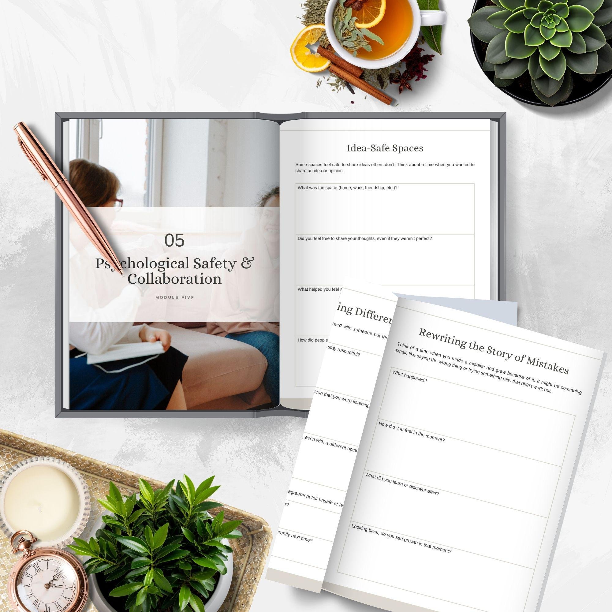 The Psychological Safety Workbook is a 29-page fully editable Canva template designed to help individuals, teams, and organizations foster an environment of trust, openness, and collaboration.